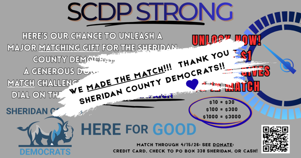 Donations may be made by check and mailed to SCDP, PO Box 338, Sheridan 82801; in person at a meeting or an event; or by using this ActBlue link-