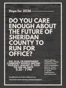 Please join non-partisan Sheridan residents who are interested in running as a candidate, encouraging someone you know to run or helping good candidates in 2026. School board to state legislature! Learn about eligibility, filing requirements and campaign basics. For more information email – candidatesforsheridanwy@gmail.com.